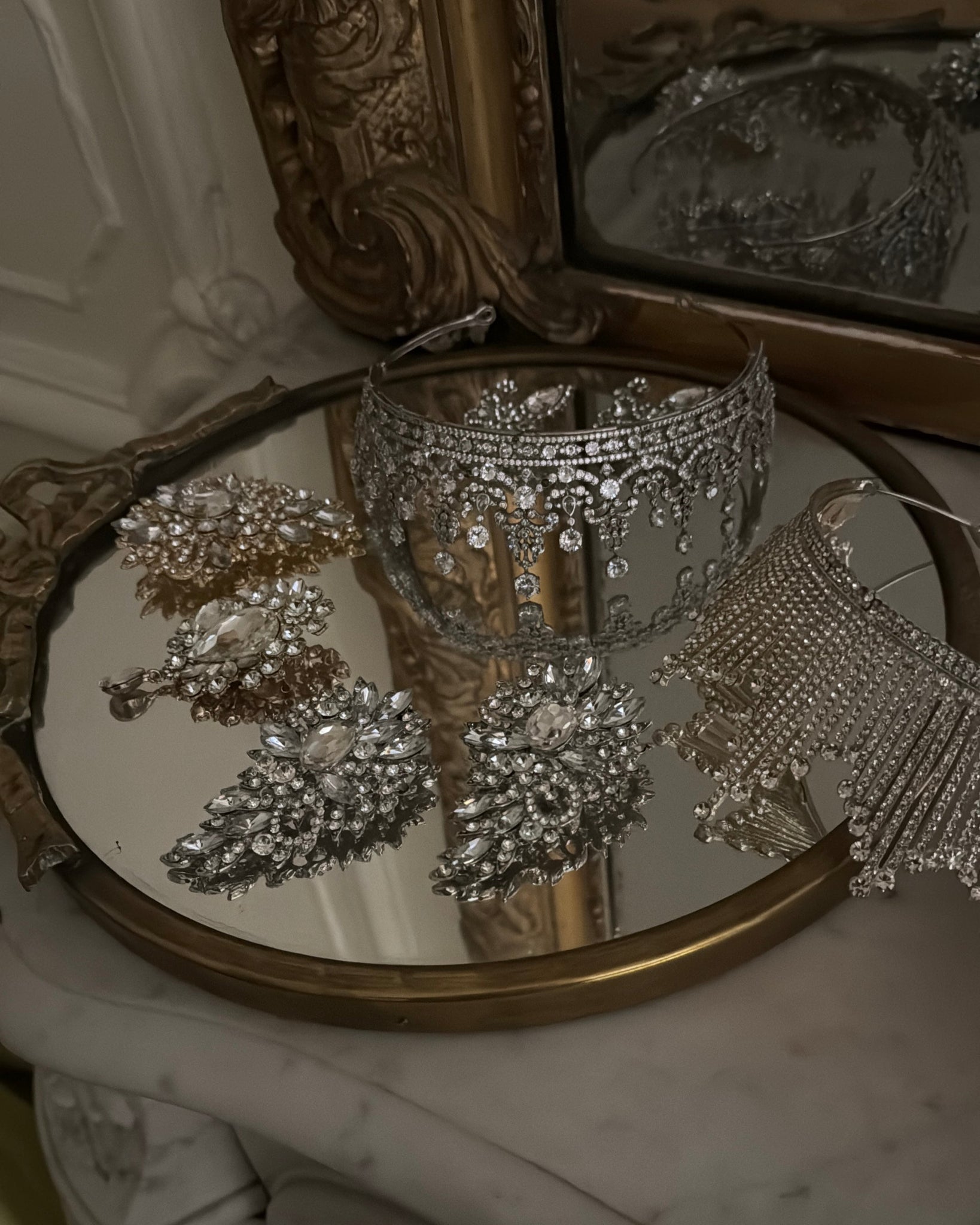 The Couture Waterdrop brooch is an piece created for you in Silver tone plated brass metal, set with glass and acrylic stones, and featuring as a continuous signature jewellery piece in the couture collections.